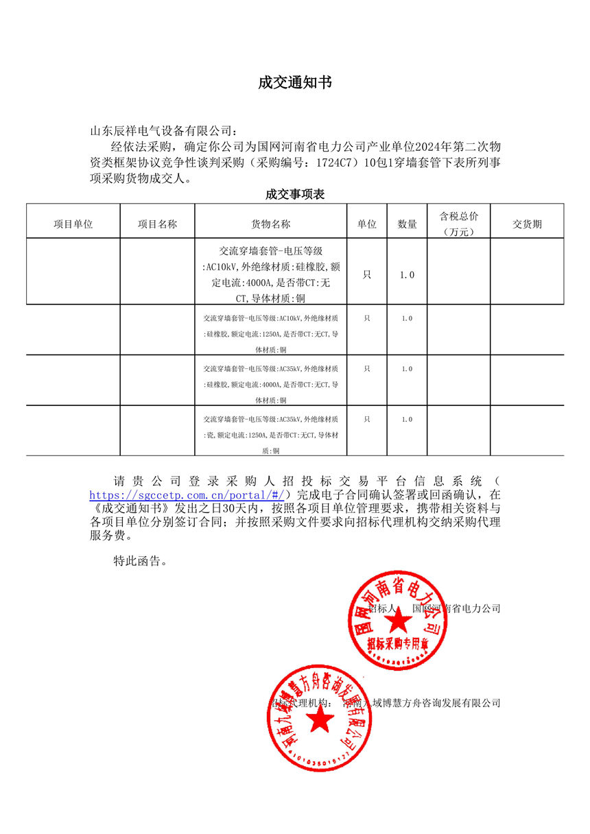 • 2025.02.14 110kV瓷絕緣穿墻套管中標通知書